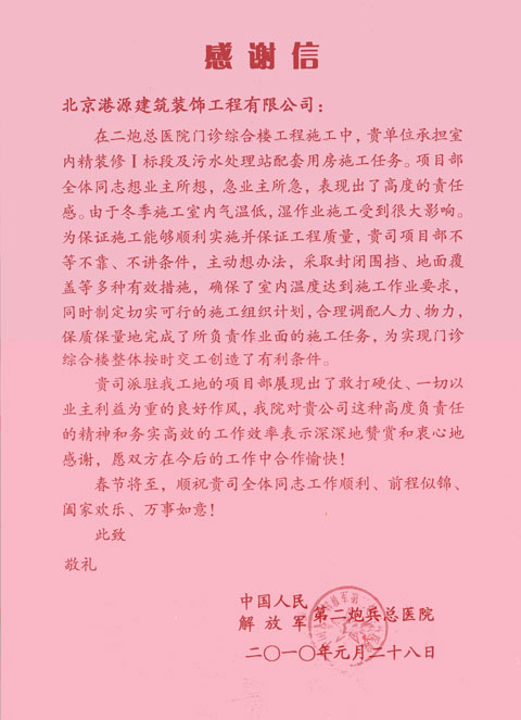 第二炮兵总医院项目感谢信