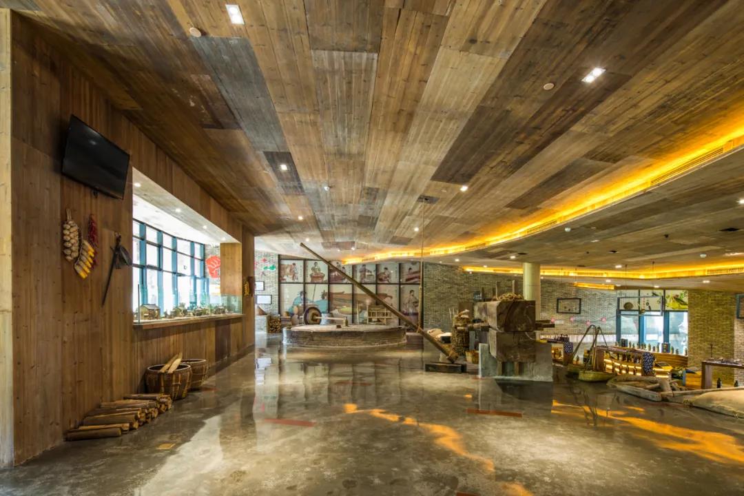 为了给游客带来沉浸式体验,港源装饰项目团队在针对茶油工坊进行室内装修时,安排专人去当地村落中逐户寻找原生态老木板,加以梯田式屋梁造型施工,从细微之处便竭尽所能地还原我国古老文明的古朴雅致和文化底蕴。