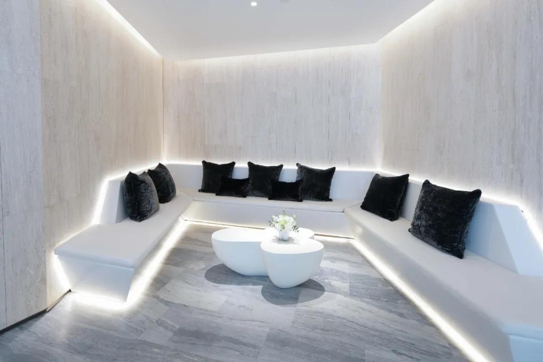 为了实现设计师的美学初衷,完美还原空间斜面造型的线条韵律,港源装饰项目团队从材料甄选、放线施工、对缝铺装、不锈钢格栅、无框灯具等节点展开详细策划及精密计算,通过材料小样、工艺小样、实体工艺样板等120余次打样确认,最终完美实现设计初衷。特别是在面对全部石材错拼施工的墙地面时,诺大的空间没有相同尺寸、相同纹理的石材,港源装饰项目团队与甲方管理团队、程绍正韬设计团队密切配合,将石材下单图以最短时间绘制并确认,按照预设编号及纹理铺装,最终达到了“顺纹不对纹”的空间美学效果,完美呈现出石材本体的自然之美。