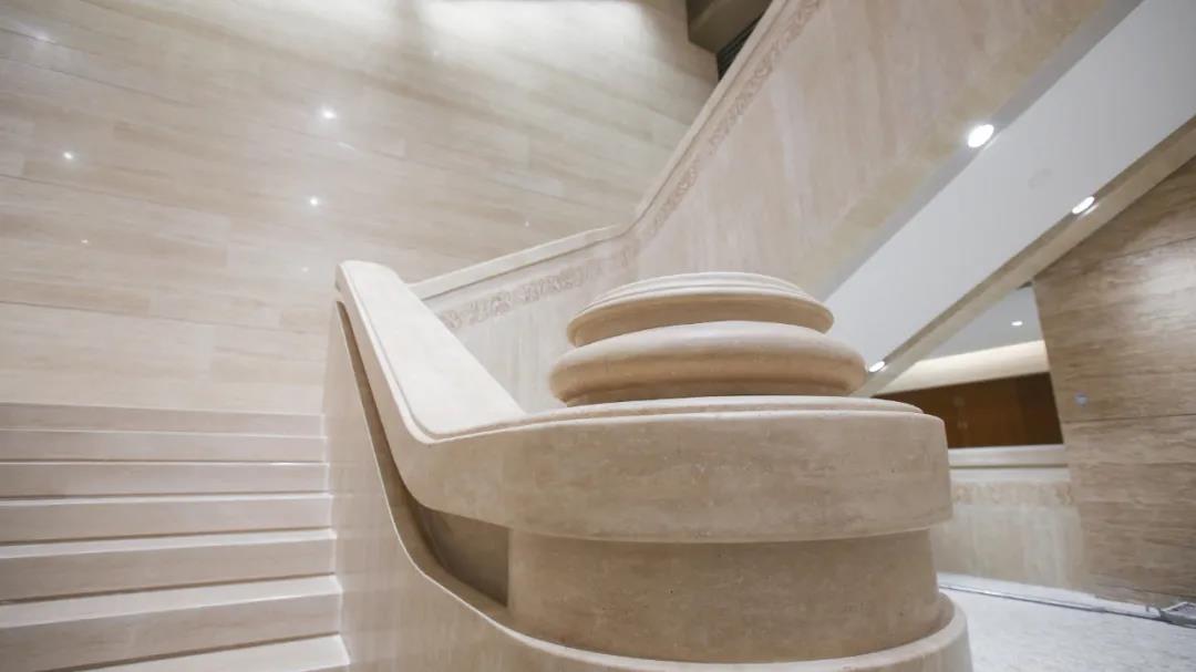港源装饰把深、浅两色罗马洞石分别雕刻成形,再将深色石材花纹镶嵌进浅色石材扶梯中,随之加以精细打磨而成。