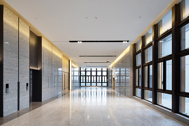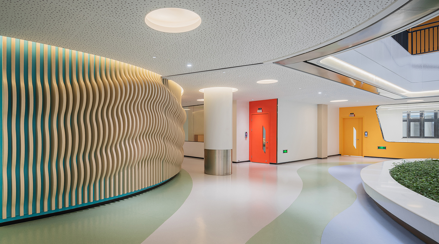 校园环境关乎着每一位孩子的身心健康,因此,学校建设更应严格强调工程质量的安全环保。对于这一方面,港源装饰与甲方的意见高度统一,因此仿木纹金属墙面便成为亮亮中学室内环境的重要材质。仿木纹金属墙面不仅有极佳的质感,而且具备环保、防潮、抗菌等优势,但金属材质易变形的属性也同时存在。为了坚持环保优先原则,港源装饰团队反复论证,决定增加轻钢龙骨等基层处理工序来保障金属墙面的平整度及垂直度,并且达到了易于拆装、降低维护成本的目的。