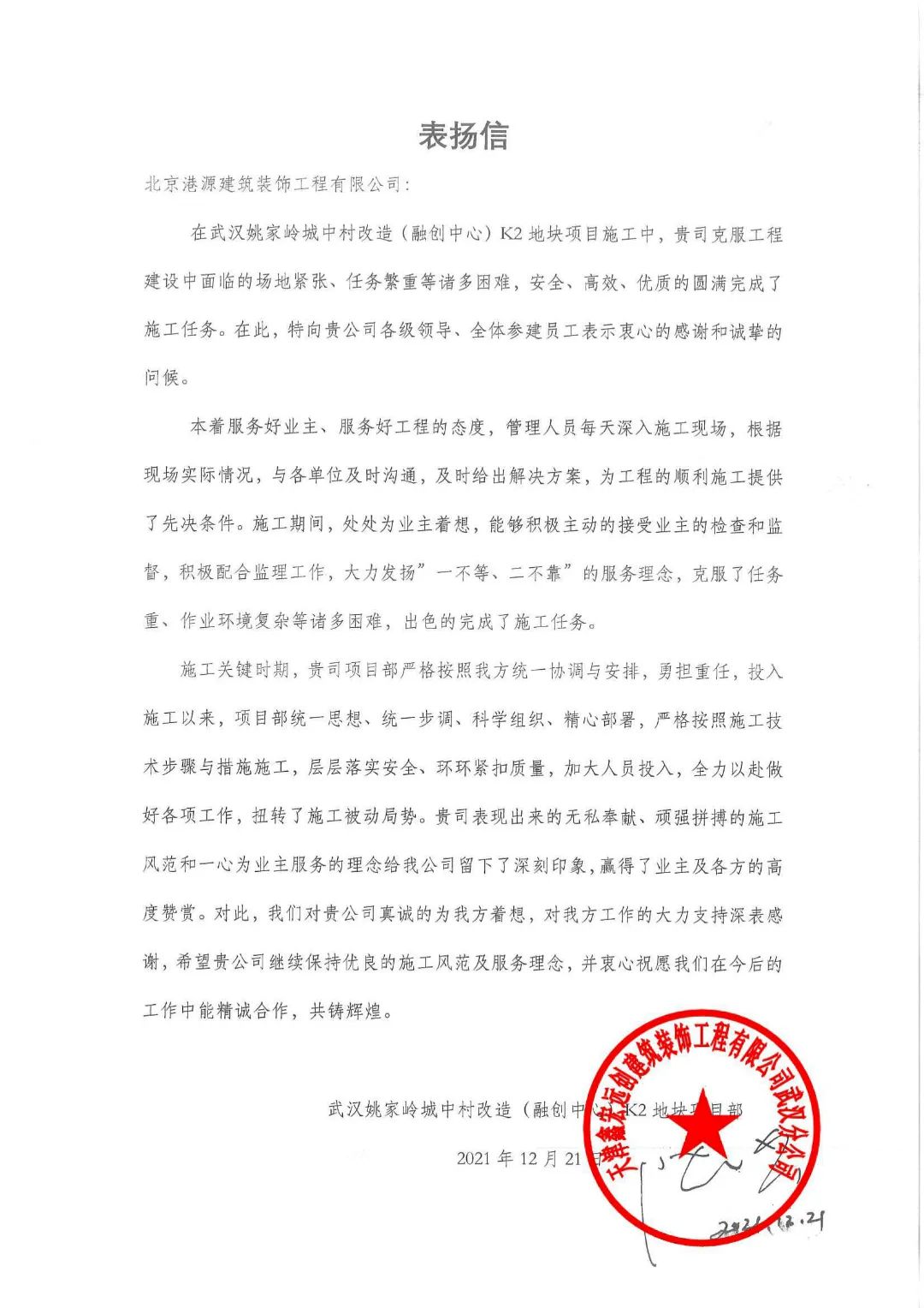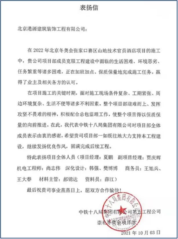 一封封表扬信、感谢信,是对港源品牌的认可,也是对全体项目管理人员付出的肯定,更是鞭策我们不断提高服务质量的动力。在今后的施工管理服务中,北京港源将坚持以“让客户更满意”为宗旨,以适应客户的多样化需求。