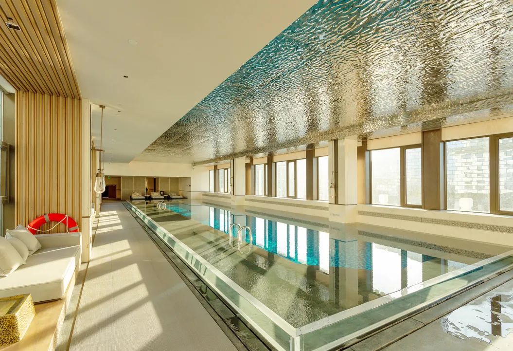 高层泳池位于酒店五楼,在扩大使用面积的同时升级改造为无边泳池,属于酒店施工的重点控制区域。港源项目团队在泳池施工过程中严格把关,采用透明材质作为护栏,当池水恰好漫过护栏便呈现出无边水面效果,完美实现了设计初衷。